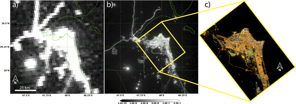 It is worthwhile to point out the differences between the lunar reflectance (Equation (1)) and what is provided by the “Near Constant-Contrast” (NCC) imagery that is currently available as a VIIRS/DNB environmental data record (EDR). The imagery that can be produced via through Equation (1) (shown in Figure 3b) is of similar appearance to NCC under moonlit conditions. However, the NCC computes a pseudo reflectance, drawing heritage from DMSP legacy algorithms, and includes a parameterized handling of twilight illumination near the terminator [14]. Since Equation (1) does not accommodate a diffuse solar (twilight) source, lunar reflectance imagery can be produced only in areas where there are no solar contributions (e.g., requires solar zenith angle > ∼109°) and moonlight is present. In contrast, NCC provides a continuous pseudo-reflectance across the terminator. As such, the NCC in its current form is appropriate for qualitative imagery purposes under all illumination conditions, and an approach following Equation (1) is recommended for quantitative lunar applications.