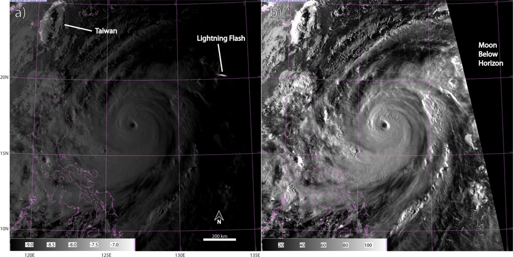 Application of lunar irradiance model to convert VIIRS/DNB observations of Typhoon Jelawat (25 September 2012, 1701 UTC). (a) In-band radiance (log10[W·cm−2·sr−1]) units shows rapid darkening toward the lunar terminator (the Moon is low in western sky for this region at the time of the S-NPP overpass). (b) Reflectance (%) units provide enhanced storm-top detail for lunar-illuminated portion of the scene.