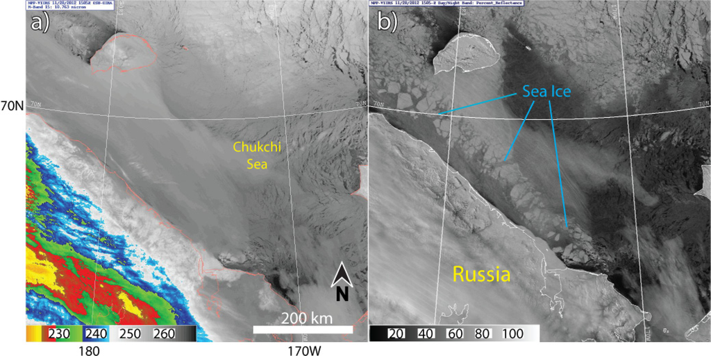Comparison between (a) VIIRS/M15 thermal infrared imagery (kelvins) and (b) VIIRS/DNB lunar reflectance (%) imagery of sea ice in the Chukchi Sea on 28 November 2012, 1505 UTC. The DNB lunar reflectance offers the unique ability to peer through semi-transparent clouds that are opaque at thermal infrared wavelengths, revealing the sea ice structures residing below them.