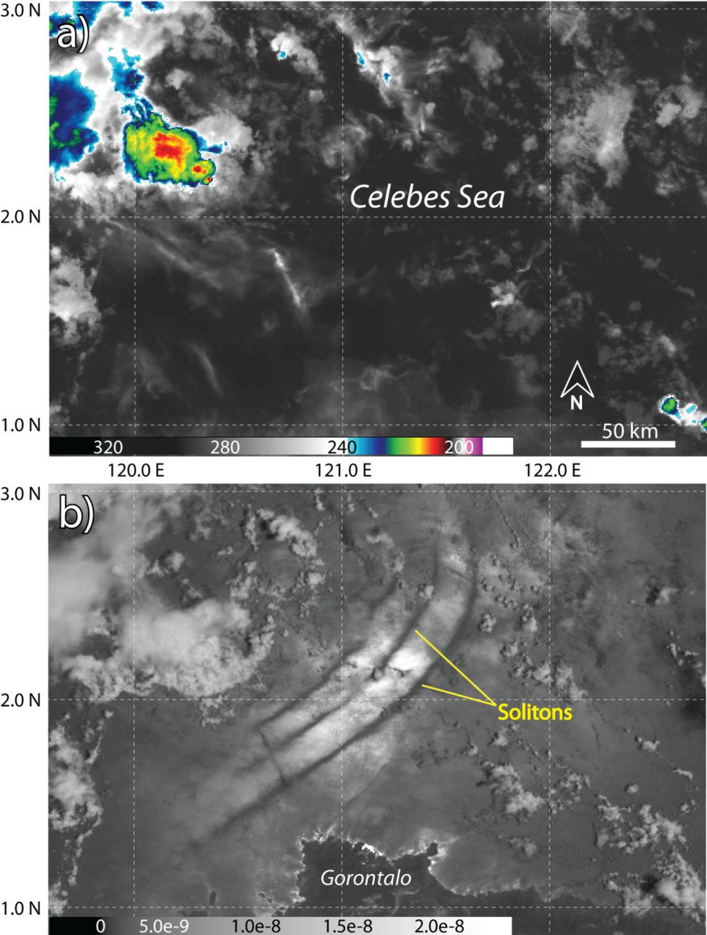 (a) VIIRS M15 thermal infrared imagery (K) of the southern Celebes Sea (Indonesia) from 30 January 2013, 1723 UTC provides details on the cloud distribution, while (b) corresponding DNB lunar radiance imagery (W·cm−2·sr−1) reveals an internal solitary wave packet (appearing as dark curved lines) modulating the otherwise bright moon glint region.