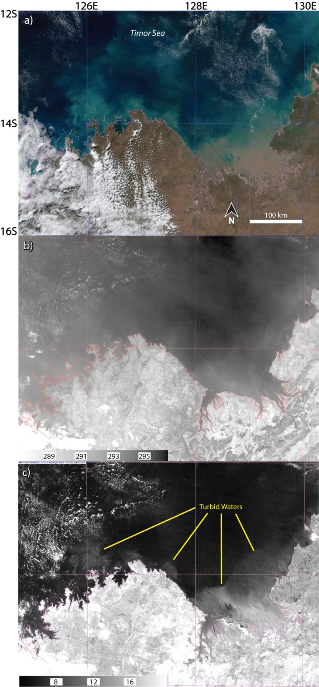 Timor Sea water turbidity observed by VIIRS in (a) daytime true color (27 June 2013, 0506 UTC), and the previous evening (26 June 2013, 1634 UTC) for the same coverage area via (b) thermal infrared (M15) imagery (K), and (c) corresponding DNB nighttime lunar reflectance (%).