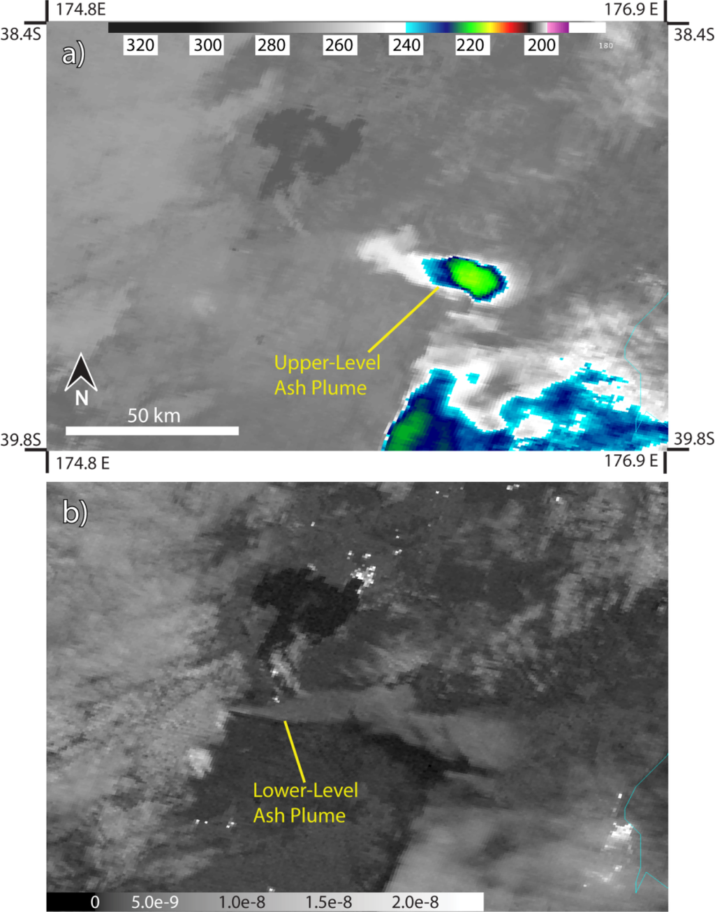(a) VIIRS M15 (10.763 μm) Brightness Temperature image on 6 August 2012, 1252 UTC identifies the colder (higher/thicker) portions of an ash plume produced by the Tongariro Volcano in northern New Zealand. (b) Corresponding Day Night Band lunar radiance imagery (W·cm−2·sr−1) more readily reveals the full extent of the plume, including low-level ash closer to the volcano.