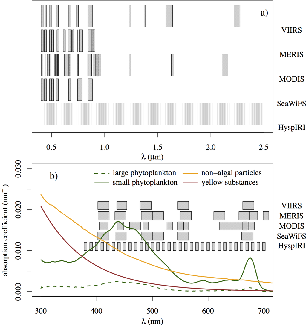 (a) Spectral coverage of HyspIRI and standard ocean color sensors in the VSWIR region; (b) Absorption coefficients of phytoplankton (small and large cells), non-algal particles, and yellow substances, and the spectral coverage of the aforementioned sensors in the visible region. All bands are shown for MODIS and MERIS (MEdium Resolution Imaging Spectrometer), some of which overlap. However, only the moderate resolution bands are shown for VIIRS (Visible Infrared Imaging Spectrometer).