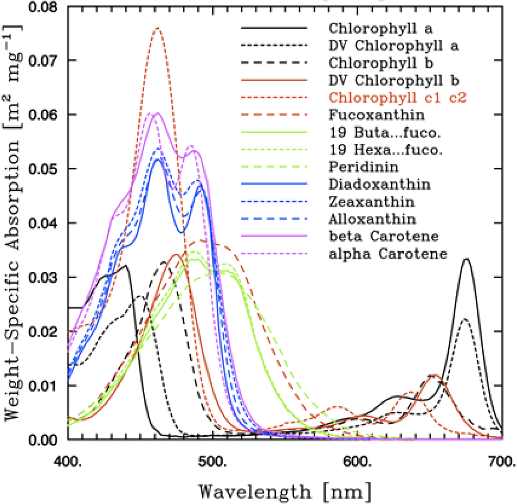 , derived from measuring the absorption spectra of individual pigments in solvent and shifting the maxima of the spectra according to the method described by Bidigare et al. []. The spectra were generated using data published by Annick Bricaud [].