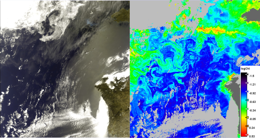 MERIS false color image acquired off the coast of Portugal on 21 June 2005 (left) and chl-a concentration derived by the POLYMER algorithm (right). The algorithm was able to retrieve chl-a concentration in the presence of thin clouds and sun glint (Courtesy of F. Steinmetz).
