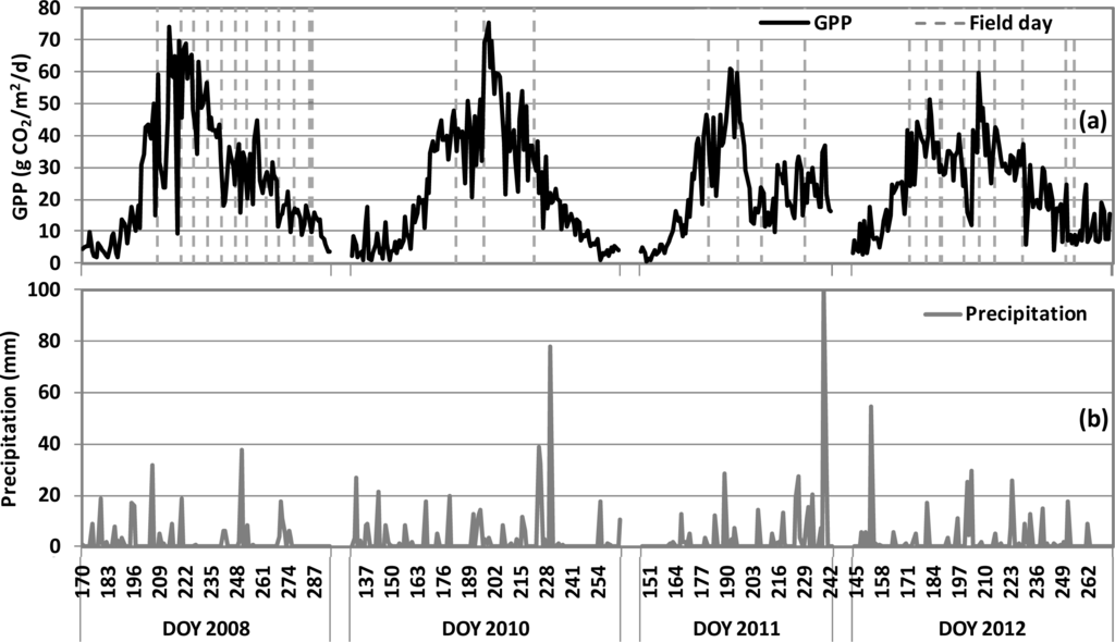 The different cultivars planted each year produced variable leaf area indices (LAI) and maximum mid-season GPP, having been influenced by planting date and environmental conditions (Table 1). Daily GPP derived from tower-based eddy covariance measurements in the cornfield over four growing seasons is shown in Figure 1a. The grey dashed lines indicate the days when field campaigns were conducted. Corresponding daily precipitation, daily PAR, and daily average and high temperature observations are reported in Figure 1b–d, respectively. Clear seasonal dynamics were observed for GPP, which increased during the green-up vegetative stage, reached the highest productivity during mid-season, and steadily declined after that (Figure 1a). Within this general seasonal trend, an increase in GPP was usually observed after a noticeable precipitation event (Figure 1a,b). The highest mid-season GPP value (∼75 g CO2/m2/d) was observed in early August of 2008 and in mid-July of 2010 (Figure 1a; Table 1), and comparable GPP values and seasonal patterns were observed in those two years. Lower maximum mid-season GPP values were observed in 2011 and 2012, mostly due to unfavorable environmental conditions, such as unseasonably high temperature and/or lower precipitation (Figure 1b,d).