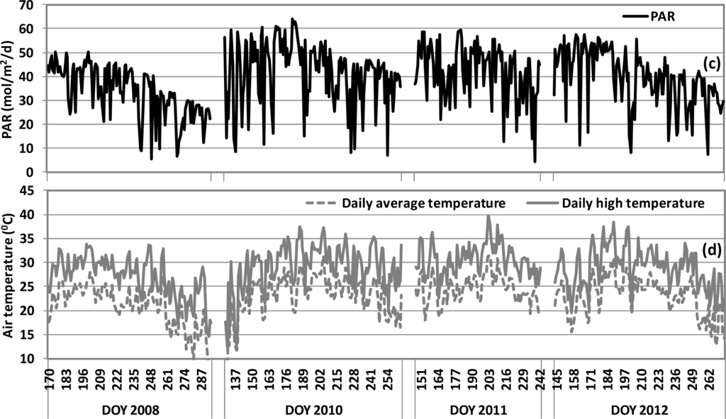 Seasonal variations of (a) daily GPP (g CO2/m2/d); (b) daily precipitation (mm); (c) daily PAR (mol/m2/d); (d) daily average and high air temperature in USDA BARC OPE3 cornfield for four growing seasons. X-axis values indicate day of year (DOY) in 2008, 2010, 2011, 2012. The vertical dashed grey lines in panel (a) indicate field days.