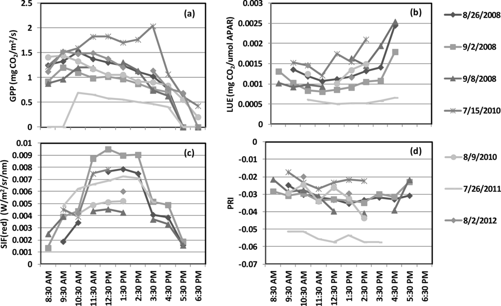 We documented inter-annual and diurnal variations in the optical indices as well as GPP values (Figure 1), which were influenced by weather conditions. Precipitation in this rain-fed field increased GPP values. But unseasonably high temperatures, observed in the middle of the 2011 season and in 2012 during the vegetative stage, created strongly expressed canopy stress which reduced productivity and GPP. Diurnal GPP cycles showed higher mid-day production when the vegetation was exposed to abundant solar radiation. However, both the SIF and PRI responses indicated that plants experienced physiological stress during mid-day, also induced by high solar radiation and temperatures. Higher SIF and lower PRI values expressed higher stress conditions during mid-day, while lower SIF/higher PRI values described stress abatement during early morning and late afternoon (Figure 2c,d). This diurnal trend was captured in the tower-based LUE, which exhibited the opposite diurnal dynamics to GPP (Figure 2a,b). A similar pattern to diurnal trends was seen in the seasonal trends of GPP, PRI, and SIF (Figure 3). Certain growth variables (e.g., LAI, phenological stage) affected the observed values for GPP, PRI and SIF. In 2008, NDVI value remained fairly consistent across the field season. On the contrary, both PRI and SIF displayed seasonal changes in concert with GPP that year, similar to the results for a sorghum field [75]. This shows that the PRI and SIF provide information that is more related to photosynthetic function than might be inferred from the NDVI.