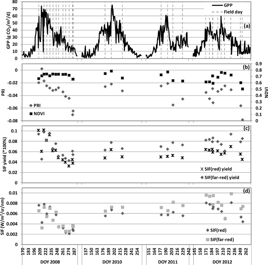 The seasonal changes of NDVI, PRI and SIF are shown as daily average values, along with daily GPP values, in Figure 3. NDVI expressed little seasonal change during the 2008 field season but had more variation in the other years. However, the PRI and SIF values exhibited pronounced variations in magnitude and seasonal dynamics across the four growing seasons. Towards the end of the growing season in 2008, 2011, 2012, the PRI values declined rapidly to notably lower values during the senescent stage (Figure 3). In general, the PRI and all of the SIF variables had seasonal trends similar to GPP.