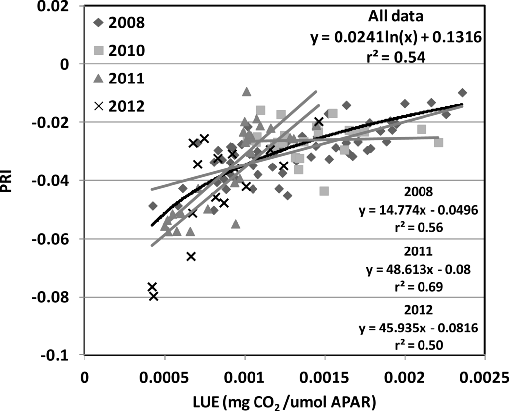 We investigated using PRI and SIF to model two important photosynthetic parameters, LUE and GPP. The statistics of modeling LUE using PRI and SIF are summarized in Table 3. In general, SIF by itself did not generate strong relationships with LUE when examined over time. By itself, however, the PRI exhibited the best correlation with LUE (r2 = 0.45, RMSE = 0.000324 mg CO2/μmol PAR). Nevertheless, as shown in Figure 4, the relationship between PRI and LUE was not consistent among the four years (grey lines). Linear fit with r2 of 0.56, 0.69, 0.50 was found for 2008, 2011, 2012, respectively with different slopes and offsets (Figure 4). By applying a logarithm fit, a 9% improvement was observed for the PRI model over the four-years (r2 = 0.54, RMSE = 0.000322 mg CO2/μmol PAR, Figure 4, black line). By combining the PRI with any SIF variable, substantial improvements in relationships to LUE and GPP were achieved. For LUE, a 16% improvement over the linear PRI model, and a 7% further improvement over the log PRI model, was obtained for the model that combined the PRI with the SIF (red) yield (r2 = 0.61, RMSE = 0.000275 mg CO2/μmol PAR; Table 3). The statistics of modeling GPP using PRI and SIF are summarized in Table 4. For GPP, ≥24% improvements over the linear PRI model (r2 = 0.54, RMSE = 0.2770 mg CO2/m2/s) were obtained for the models that combined the PRI with either the SIF (far-red) (r2 = 0.78, RMSE = 0.1894 mg CO2/m2/s) or with the SIF (red). The SIF (red) retrieval provided the strongest performance overall (r2 = 0.80, RSME = 0.1994 mg CO2/m2/s; Figure 5; Table 4).