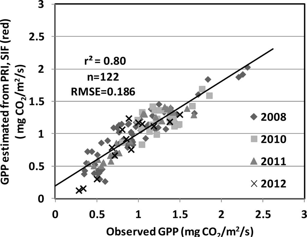 Performance of the GPP model (r2 = 0.80, RMSE = 0.186 mg CO2/m2/s) using both the PRI and the SIF (red) observations from four growing seasons (2008, 2010–2012) in the USDA BARC cornfield.
