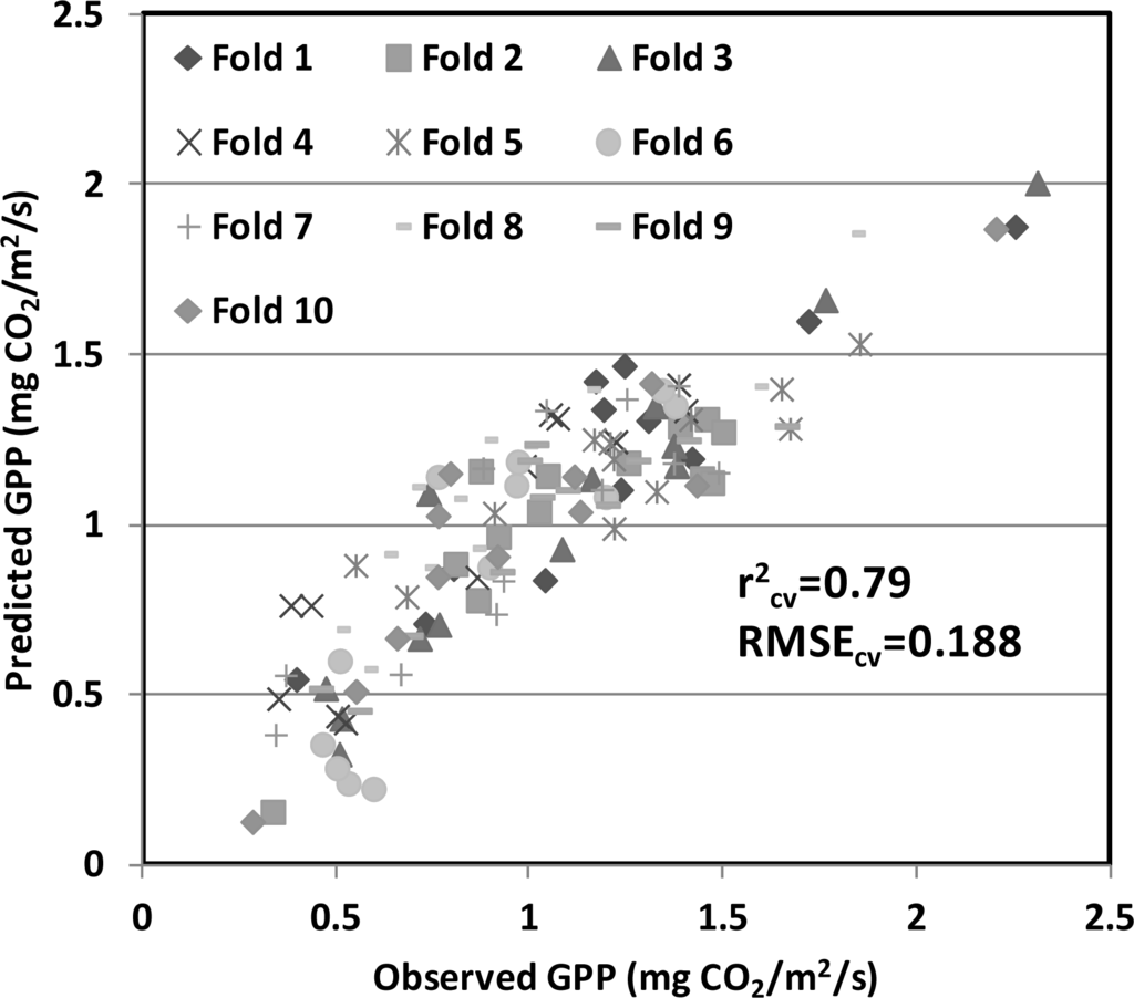 Cross-validation approaches are designed to evaluate the robustness and consistency of statistical models. One crucial factor about cross-validation is the strategy to divide the entire dataset into training and validation data, using a random sampling and a systematic partitioning to test our results. We demonstrate that the GPP model based on 2008 data was able to predict GPP using PRI and SIF (red) in the three other years—2010, 2011, and 2012. This highlights the robustness of the integration of PRI and SIF (red) to capture important information about physiological status of this cornfield, thus providing accurate estimates of carbon assimilation with small uncertainties. The k-fold cross-validation approach was also applied to the model with PRI and SIF (far-red), with only a slightly lower performance (r2cv = 0.77, RMSEcv = 0.205 mg CO2/m2/s). It can be difficult to retrieve SIF (red) from space [108] since it is a narrower and weaker feature than SIF (far-red), and this capability has yet to be attained. Even though our results suggested better performance of SIF (red) to model photosynthetic processes in ground level studies, we also demonstrated the potential for using SIF (far-red) for carbon monitoring using satellite measurements at global level.
