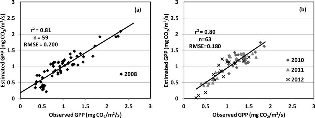 Cross-validation of the GPP model presented in Figure 5 using a systematic partitioning approach: (a) data acquired in 2008 were used as training data to develop the model; and (b) data from 2010 to 2012 were used as validation data. The results confirm the consistency of the GPP model applied over four growing seasons.