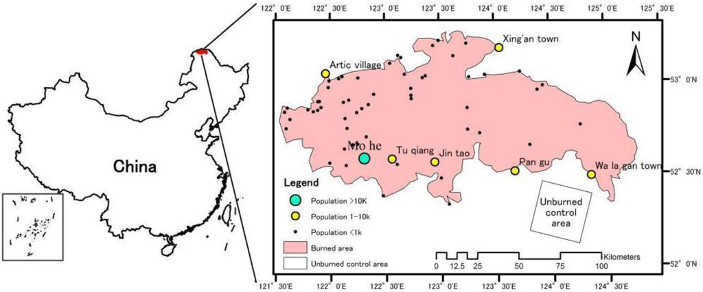 The Great Xing’an Mountain is a typical fire-prone ecosystem in which many species have a recognized ability to regenerate after fire. Historically, fire regimes in this region were characterized by frequent, low intensity surface fires mixed with sparse stand-replacing fires over relatively small areas []. The Daxing’anling fire occurred on May 6 and was located on the north slope of Great Xing’an Mountain (52°15′N–53°33′N, 121°51′E–125°05′E) in Northeastern China (Figure 1). It is primarily a hilly, mountainous region ranging from 450–1500 m in elevation. This fire burned more than 1.33 million hectares of forest resulting in the loss of over 200 lives and 50,000 homes. Fires of this magnitude are a major but infrequent disturbance to this landscape, occurring at 100- to 300-year intervals []. The Daxing’anling fire produced a strikingly heterogeneous mosaic of burn severities (effects of fire on the ecosystem) and islands of unburned vegetation across the landscape. The spatial extent and heterogeneity induced by this fire provide an ideal opportunity to study the effects of fire size and pattern on post-fire succession. The climate in this region is terrestrial monsoon with long, severe winters (mean January temperature −28.5 °C) and short, mild summers (mean July temperature 17 °C). The precipitation, which peaks in summer, is 420 mm annually and is unevenly distributed throughout the year, i.e., more than 60% occurs between June and August. Vegetation in this region falls within the cool temperate coniferous forests occurring at the southern extension of the eastern Siberian light coniferous forest []. The species composition is relatively simple and the forest covers more than 75% of the study area. The most dominant tree species is larch (Larix gmelini), accounting for 80% of the study area, followed by birch (Betula Platy Plylla), which covers 10% of the study area. Other species, including pine (Pinus sylvestris var. mongolica), spruce (Picea Koraiensis), two species of aspen (Populus davidiana, Populus suaveolens), and willow (Chosenia arbutifolia) cover approximately 10% of the study area.