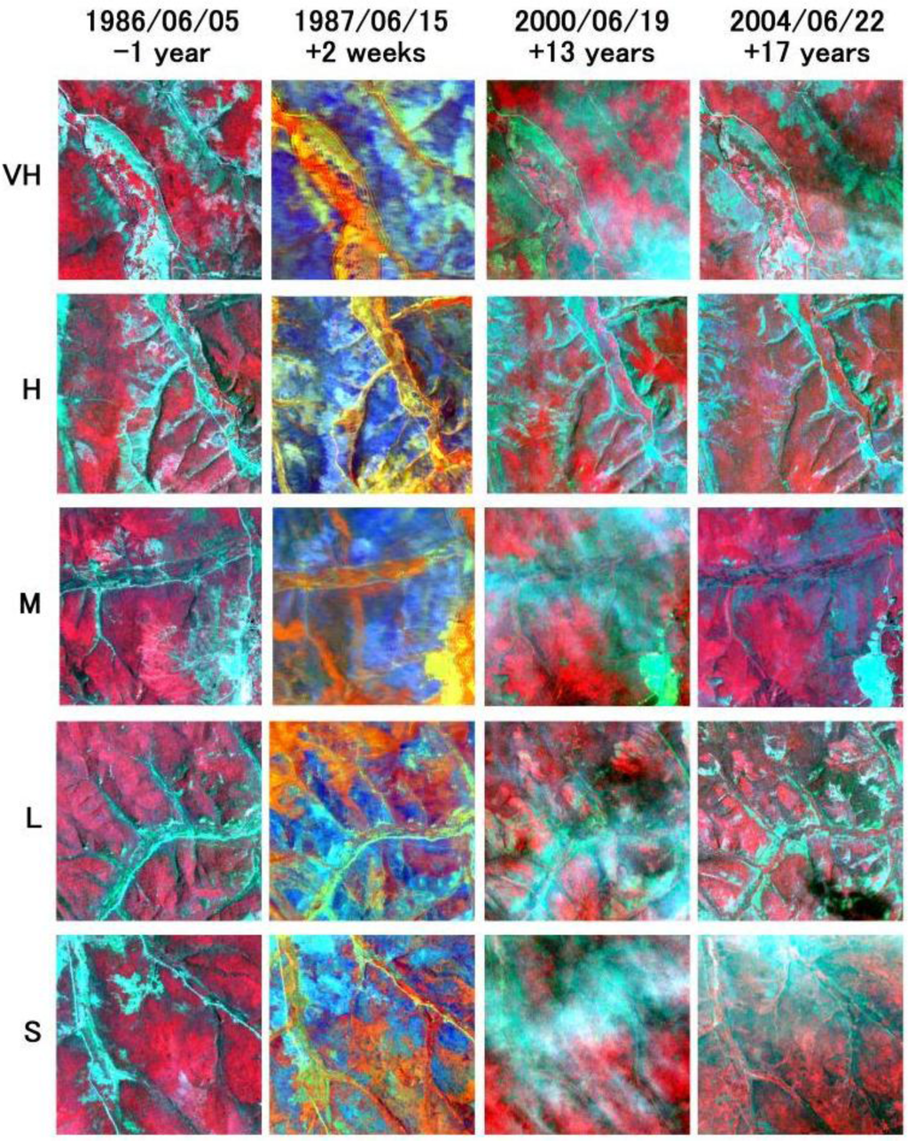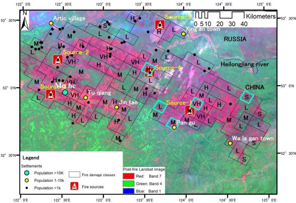 Fire sources and fire damage classes: Very high (VH), High (H), Moderate (M), Low (L) and Slight (S). The base map image is a composition of two Landsat 5 TM images from June 1987 (false color composite bands: red-band 7; green-band 4; blue-band 1). Beryl green grids were chose to track the detail vegetation signals using Landsat images with 30 m spatial resolution.