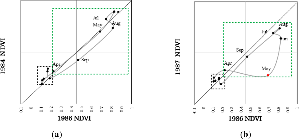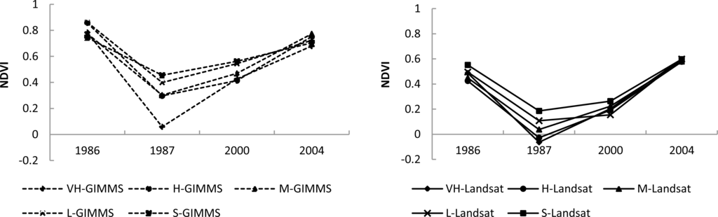 With higher spatial resolution than NOAA/AVHRR, enable the delineation of NDVI with a higher degree of accuracy. We attempted to assess the agreement of the GIMMS NDVI by comparing with NDVI extracted by Landsat TM/ETM+ sensors. We used Landsat TM and ETM+ data due to the relatively high spatial (30 m) and spectral resolution of the sensors. Moreover, Landsat TM data are available in the 1980s; the response of post-fire vegetation may be estimated using these data. Five 8 km × 8 km simples were acquired for the same location with GIMMS NDVI to track the detail vegetation signals in Landsat imagery (Figure 4). Landsat images were selected at close dates (5 June 1986, 15 June 1987, 19 June 2000 and 22 June 2004) in order to avoid the influences of phenological differences (Table 1 and Figure 10). To account for differences in the temporal resolution, GIMMS 15-day images nearest to the Landsat sample acquisition date were selected.