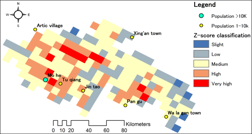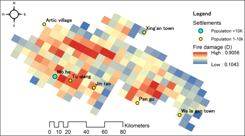Fire damage map of the study area for the Daxing’anling fire event with fire damage values obtained using Equation (1).