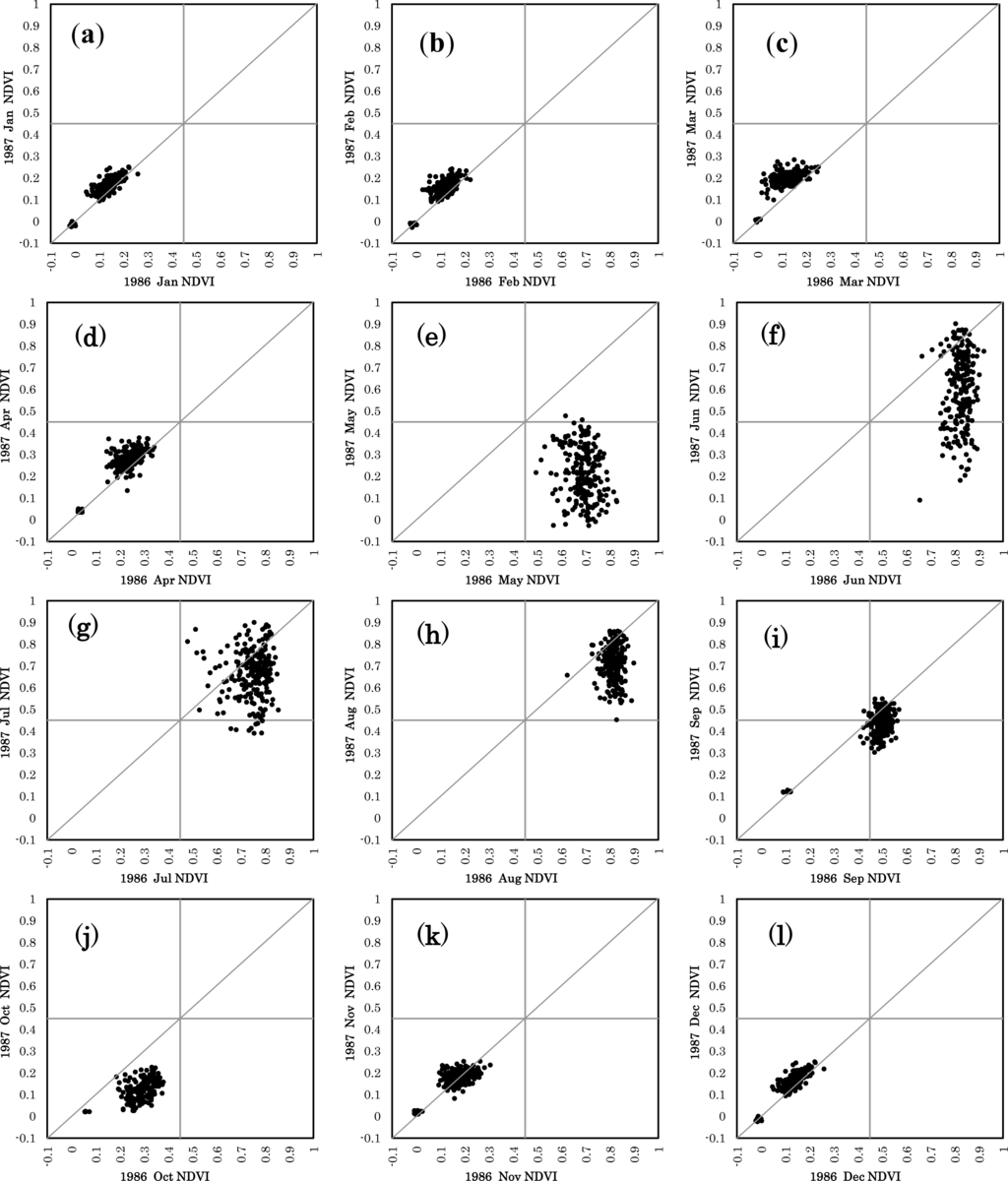 Monthly scatterplots of post-fire normalized difference vegetation index (NDVI) (1987) versus pre-fire NDVI (1986) ((a) January, (b) February, (c) March, (d) April, (e) May, (f) June, (g) July, (h) August, (i) September, (j) October, (k) November, (l) December) for the large fire on May 1987.