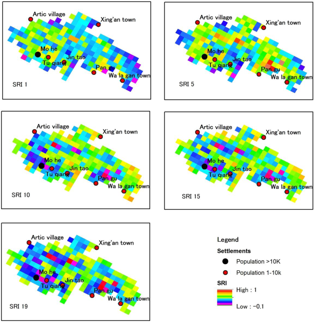 The trajectory of the post-fire stands regrowth index (SRI) for the relative year 1, 5, 10, 15 and 19.
