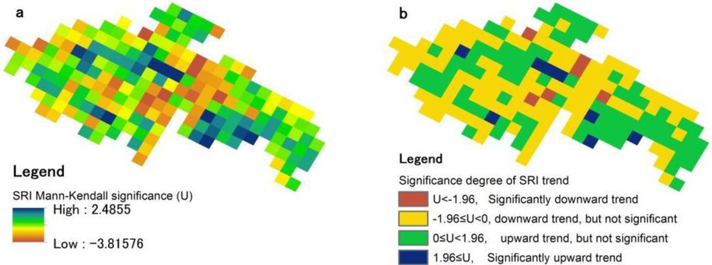 Trend significance was evaluated using a statistical rank-based nonparametric Mann-Kendall test [,], which is a commonly used method to assess the significance of monotonic trends in long-term time series. It has the advantage of not assuming any distributional form for the data and has similar capabilities as its parametric counterparts. In this study, the time series of the calculated SRIs are analyzed to identify meaningful long-term trends using the Mann-Kendall statistics. In the Mann-Kendall test, the data are ranked with reference to time; each data point is treated as the reference for the data points in successive time periods []. The equation used to calculate the Mann-Kendall correlation coefficient (S) is defined by Kendall as