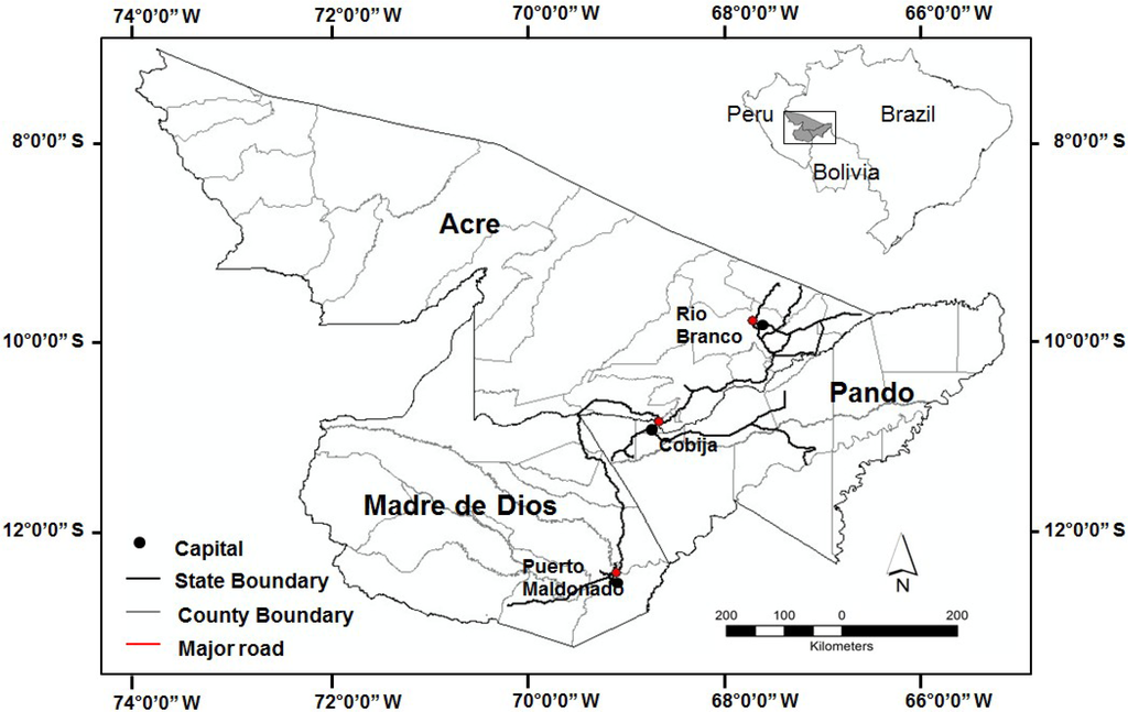 The study area is a tri-national frontier in the southwestern Amazon, where the Peruvian state Madre de Dios, Acre in Brazil, and the Bolivian department of Pando meet (termed the ‘MAP’ region, Figure 1).