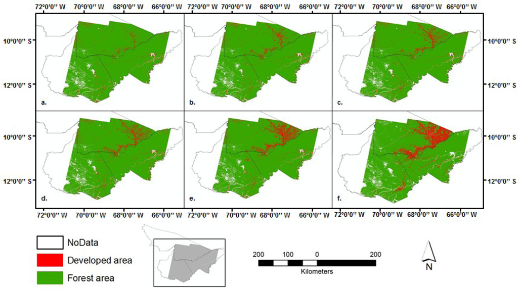 Amazon deforestation has often been seen as the most prominent galvanizing image of environmental change during the last several decades, and thus it is not easy to position this research within the literature. Focusing on the MAP region, however, Peralta and Mather [60] interpreted multi-temporal forest/non-forest maps in Acre and then calculated landscape metrics to characterize the impacts of social and economic processes on the development of the forest landscape. Millington et al.[61] measured different spatial patterns of forest fragmentation in Bolivia, and explained these patterns with reference to specific government policies. Moreover, their results also indicated that most landscape metrics were highly dependent on pixel size. Similarly, Bradley and Millington [62] discussed the mismatch between the spatial scale of biomass burning and the satellite products in Bolivia and Peru and found that an entire component of the fire region in the study region is omitted, despite its importance in the farming systems.