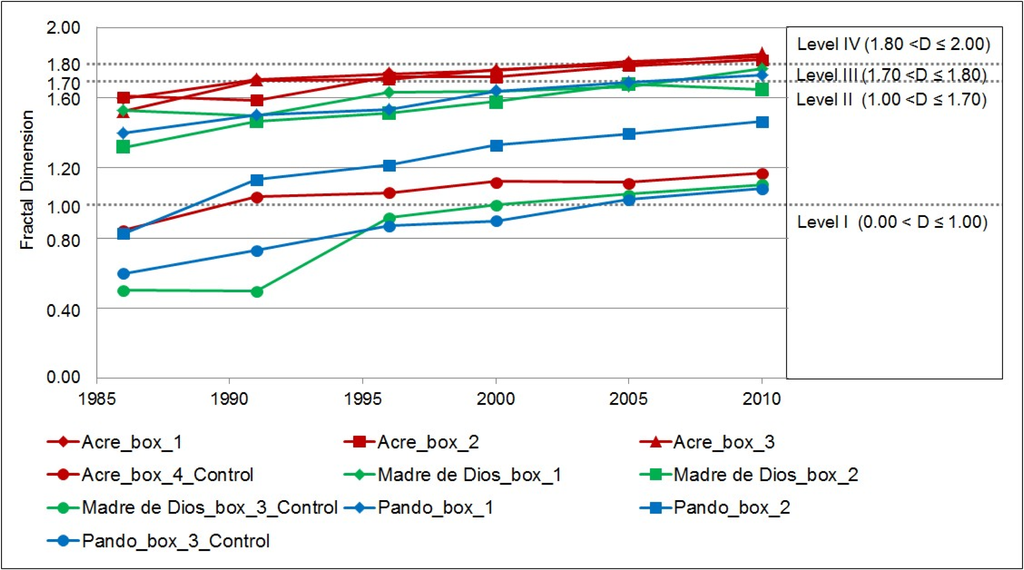 The fractal dimensions among the three states keep increasing monotonically from 1986 to 2010 (Figure 5). In Acre, the fractal dimensions of box 1 change from 1.59 in 1986 to 1.83 in 2010, box 2 changes from 1.61 in 1986 to 1.82 in 2010, and box 3 changes from 1.52 in 1986 to 1.85 in 2010. All boxes end above 1.80 by 2010, and this relatively high value, representing urbanization in level IV with very high levels of consolidation of clearings, is quite close to the maximum value of 2, and reveals that there is a strong spatial-filling capacity of the developed areas occurring within all three boxes. For Madre de Dios, the fractal dimensions of box 1 change from 1.53 in 1986 to 1.77 by 2010 and box 2 changes from 1.32 in 1986 to 1.64 by 2010. In Pando the fractal dimensions of box 1 change from 1.40 in 1986 to 1.73 by 2010 and box 2 changes from 0.82 in 1986 to 1.47 by 2010. While the fractal dimensions in Madre de Dios and Pando are lower than those of Acre, they are still exhibiting in-filling of developed areas with the most developed boxes entering level II of development by 2010, but the box 2’s still being located in level II. This does illustrate that these capital areas are developing at a faster rate in terms of urbanization and land clearing, and clump consolidation has occurred across all these box 1’s by 2010. Areas further from these regions, but still along the roads are also increasing their clearings but not yet at the higher levels of urbanization as representing by the four levels presented here.