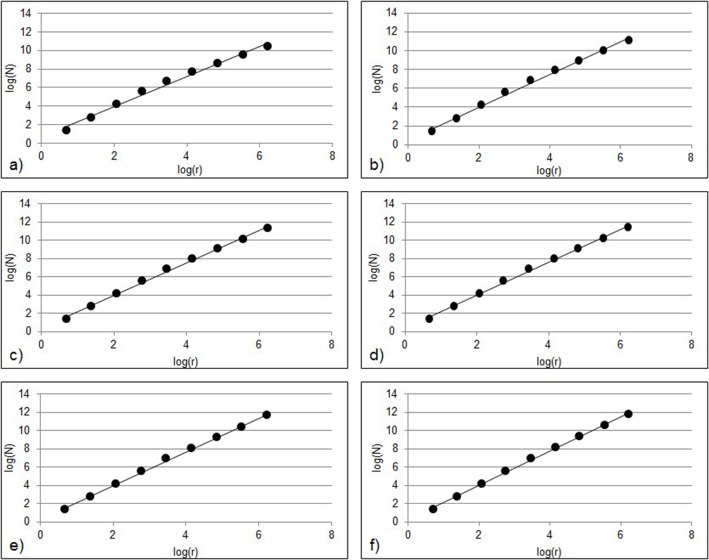 A fractal structure is self-similar if it looks like itself at different scales [38,39] and can be described by a scaling law. Consider an object in Euclidean dimension D, if we reduce its linear size by 1/r in each spatial direction, its measure (length, area, or volume) would increase to N = rD times the original. Next, taking the log of both sides, log (N) = D log (r), and solving for D, we have Equation (1)