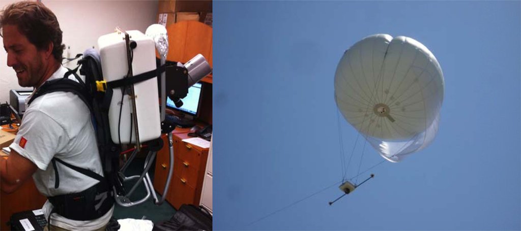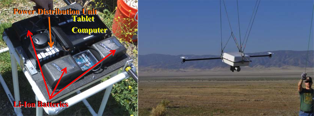 In order to assess the accuracy of the system, and to evaluate the suitability of the system for field operations, we organized a series of tests of the system in both a backpack configuration and mounted underneath a tethered 14-foot diameter helium balloon. A balloon was chosen to circumvent any problems with FAA (Federal Aviation Administration) restrictions within the US that severely limit the use of UAVs. Using a tethered balloon exempts the system from FAA restrictions. Balloon flights were successfully accomplished on 16 and 17 May 2012 on Sherman Island near Antioch, California. On 19 and 20 May 2012 the system was tested both on the balloon and in backpack mode on the Carrizo Plain near Simmler, California. For both sets of tests, two GNSS base stations were set-up within the project area to ensure that maximum baseline lengths were always less than 5 km. These local GNSS base stations were also augmented by high rate observations recorded at permanent Plate Boundary Observatory GPS stations near the project area [25].