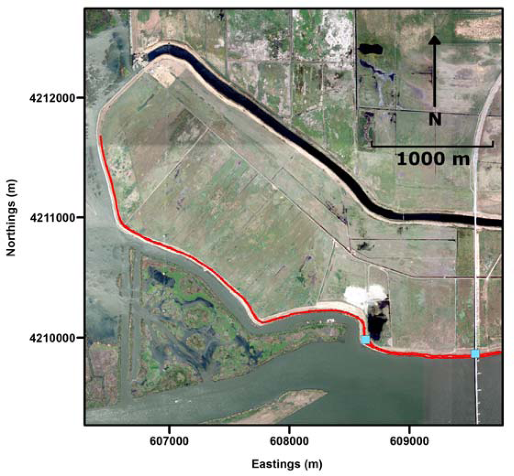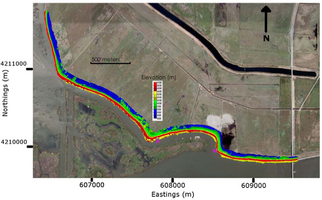 Figure 8 shows a DEM, color coded by elevation, produced using the balloon LiDAR data acquired on Sherman Island, CA. It is interesting to note that even though there were substantial (15–25 knot) winds during the survey, the field team was still able to acquire a dataset with almost complete coverage of the levee from the waterline to the toe of the inland slope of the levee for the entire surveyed section of the levee (>4 km long) in less than two hours. Asterisks notate the two areas where small segments of the levee were not captured.