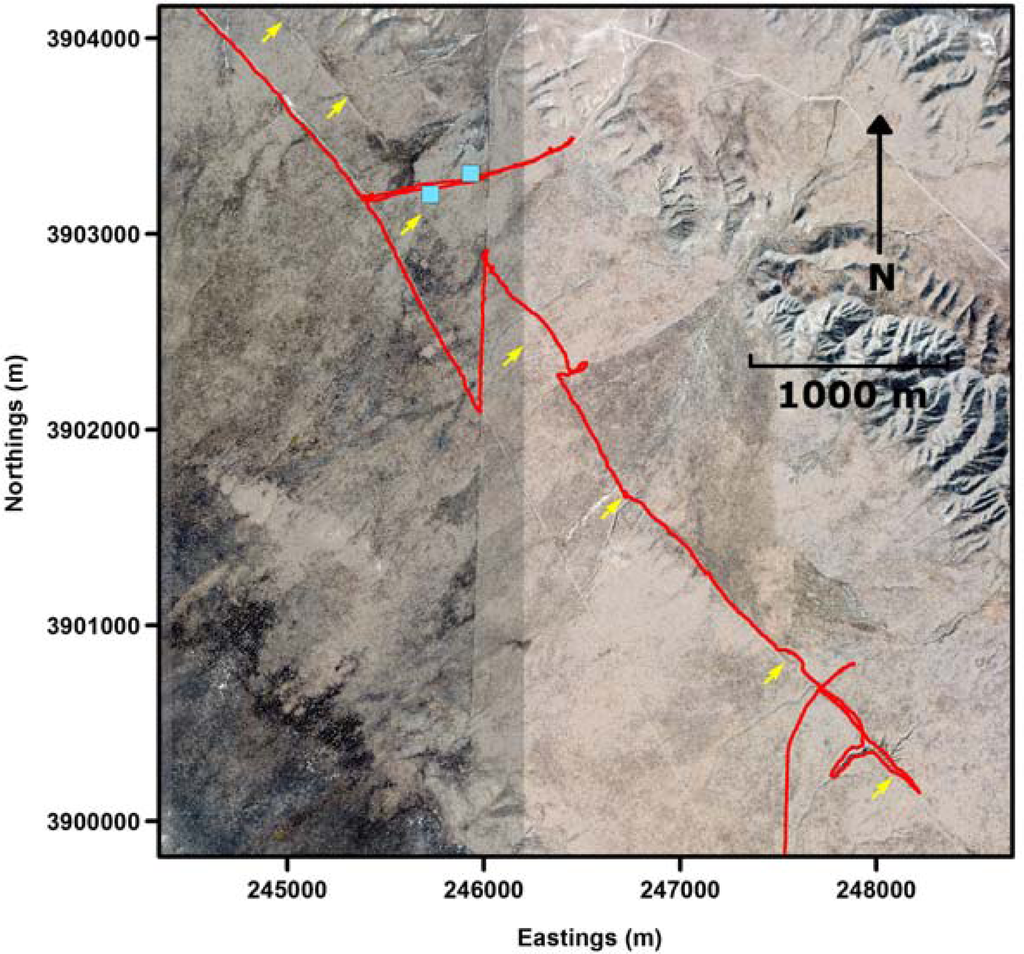 Based upon the initial successful testing on Sherman Island, we attempted a more challenging effort designed to demonstrate the range and flexible deployment characteristics of this platform. After deflating the balloon, we mobilized within several hours, replenished the Helium supply, and transited over 250 miles. After a dusk reconnaissance and evening of no activity, we began at dawn to re-inflate the balloon and scan along a well-known section of the San Andreas Fault near Wallace Creek on the Carrizo Plain [26]. This test was designed principally as a simulation of a rapid-response in the immediate hours after a surface-rupturing earthquake along the San Andreas Fault. Furthermore, tests were used to evaluate the system’s suitability for high resolution mapping in environmentally sensitive or remote regions.