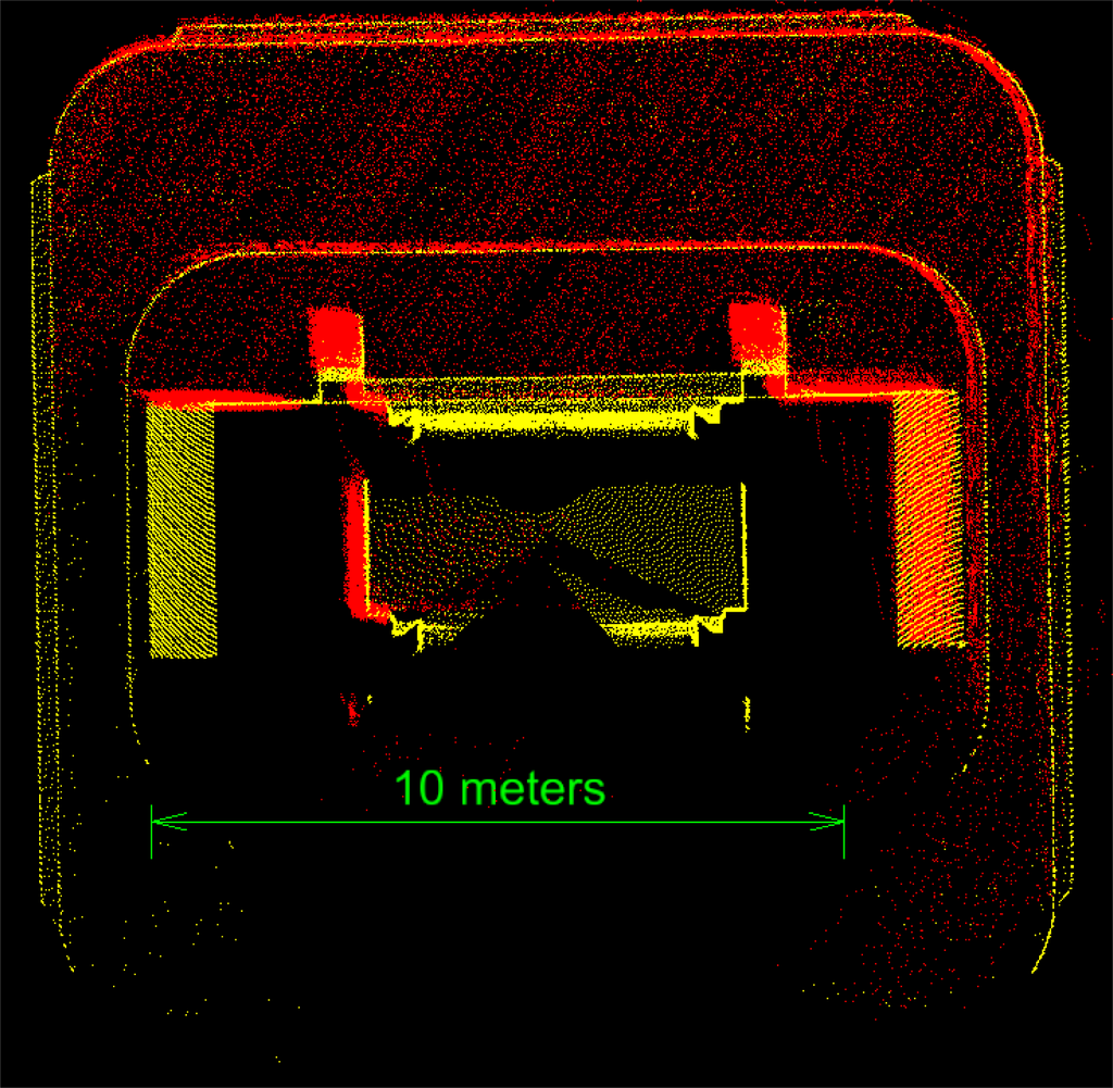 Additional calibration values are required to accurately transform the point cloud from the scanner’s own coordinate system into a global coordinate system. These calibration values are the boresight calibration matrix (angular offsets between INS and laser scanner axes), and the lever arm offset (positional offset between INS and laser scanner origins). In practice the boresight calibration matrix may only be determined by analysis of georeferenced point cloud data obtained from the laser scanning system. There are a variety of ways to determine these values, see for example [19,22,23]. For the developed system, the approach detailed in [23,24] was used to simultaneously estimate the boresight angles and the horizontal lever arm components using a non-linear least squares approach. The vertical component of the lever-arm is very weakly observable, and therefore is estimated using the engineering drawings of the subcomponents and overall system assembly.