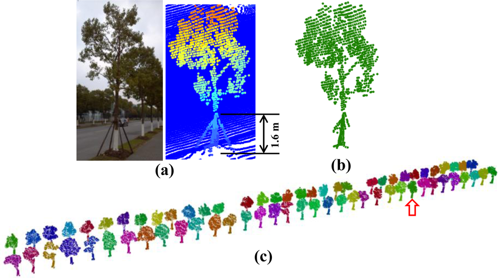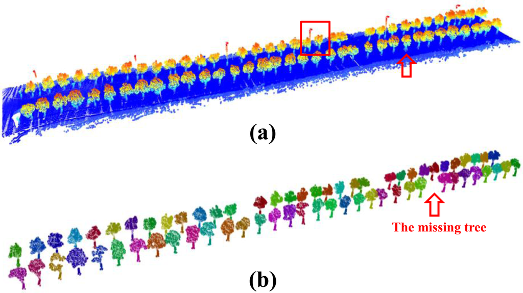 As indicated in Figure 15(a), the poles of some streetlights are attached to the neighboring trees. For example, a streetlight, marked by the red box in Figure 15(a), touched the adjacent tree crown (see Figure 17(a)). From the processing result shown in Figure 17(b), our method is robust enough to handle this complicated situation, and the trees were correctly extracted and streetlight poles successfully filtered out. The intelligence and capability of our method in handling this complex situation is due to the competing neighborhood searching algorithm and the use of the shape information of horizontal cross-sections of the tree at different height.