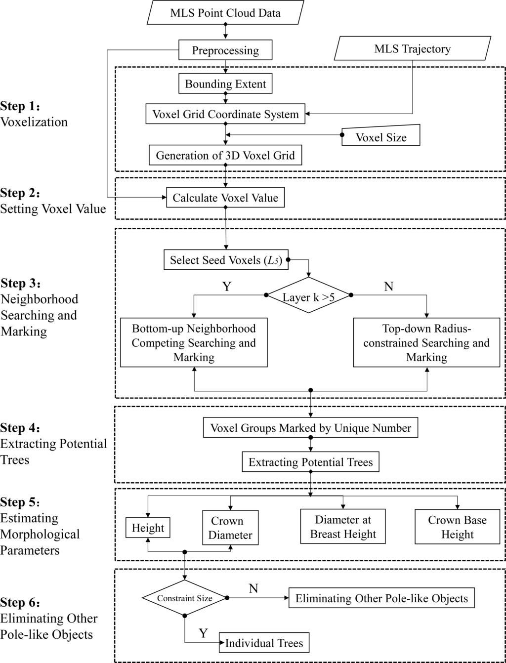 Our VMNS method contains 6 steps (Figure 2): (1) voxelization, (2) calculating values of voxels, (3) competing neighborhood searching and marking, (4) extracting potential trees, (5) deriving morphological parameters, and (6) elimination of pole-like objects other than trees.