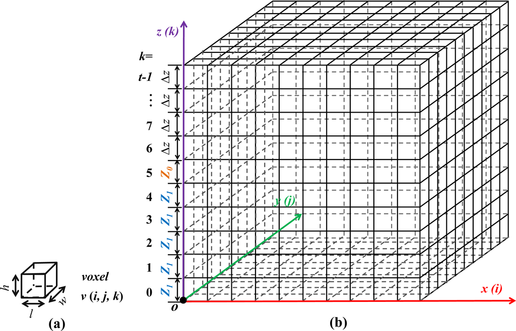 With the voxel data structure, the geographical space is conceptualized and represented as a set of volumetric elements (voxels) (Figure 3(b)). A voxel is a building block in the shape of a cuboid, and its geometry is defined by length (l), width (w), and height (h) (Figure 3(a)). The location of a voxel in 3D voxel grid system is indexed by column (i), row (j), and layer (k) (Figure 3(a,b)). Let v(i, j, k) denote a voxel, and v(*, *, k) denote the voxels in layer k (Lk). If the whole voxel grid system V has t voxel layers (Figure 3(b)), the voxel grid system can be defined as the union of all the layers (Equation (1)):