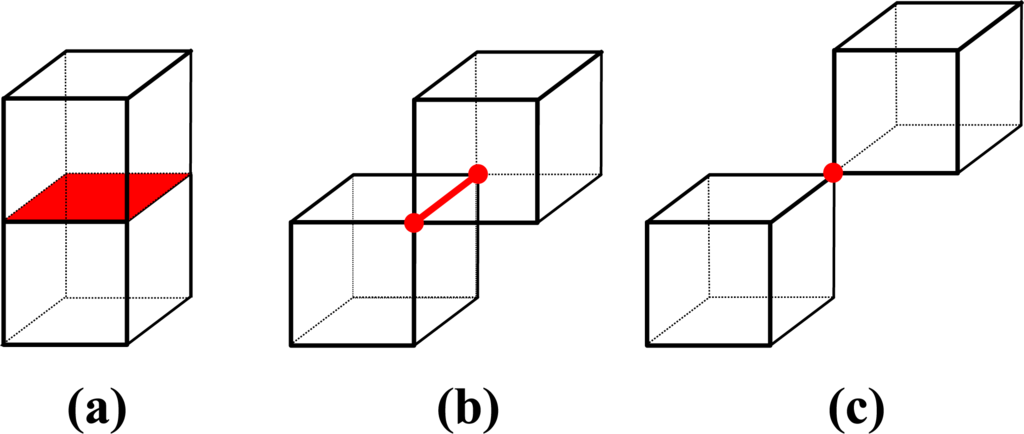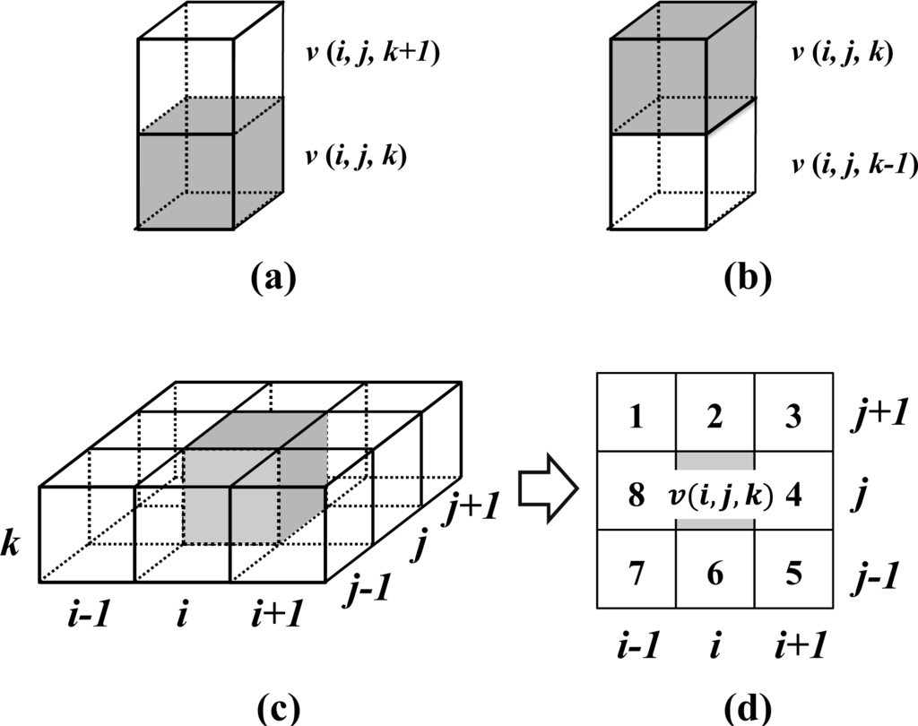Neighborhood searching is an effective approach to dealing with the region growing problem in digital image processing. Our method extends traditional neighborhood searching from a 2D image plane to a 3D voxel grid system. In a voxel grid system, each voxel has three types of neighbors (Figure 4): face neighbors, edge neighbors, and vertex neighbors. In a vertical direction, a voxel v (i, j, k) has two types of face neighbor: top face neighbor (TFN) v (i, j, k+1) (Figure 5(a)) and bottom face neighbor (BFN) v (i, j, k−1) (Figure 5(b)). In the same layer, a voxel v (i, j, k) has 8-neighbors: 4 face neighbors (v (i+1, j, k), v (i−1, j, k), v (i, j+1, k), and v (i, j−1, k)) and 4 edge neighbors (v (i+1, j+1, k), v (i+1, j−1, k), v (i−1, j+1, k), and v (i−1, j−1, k)) (Figure 5(c)). As shown in Figure 5(d), if the voxel height is neglected, the voxels in the same layer can be treated as a regular pixel grid.