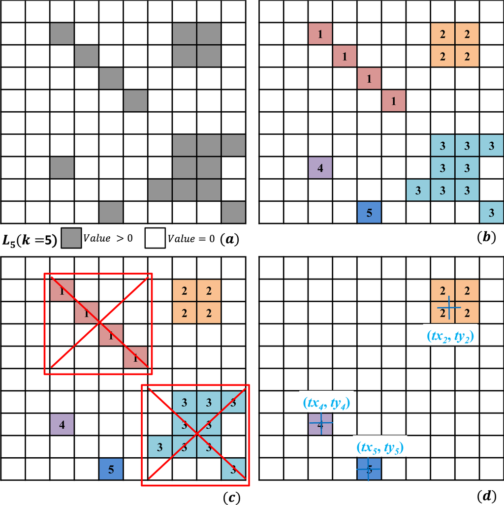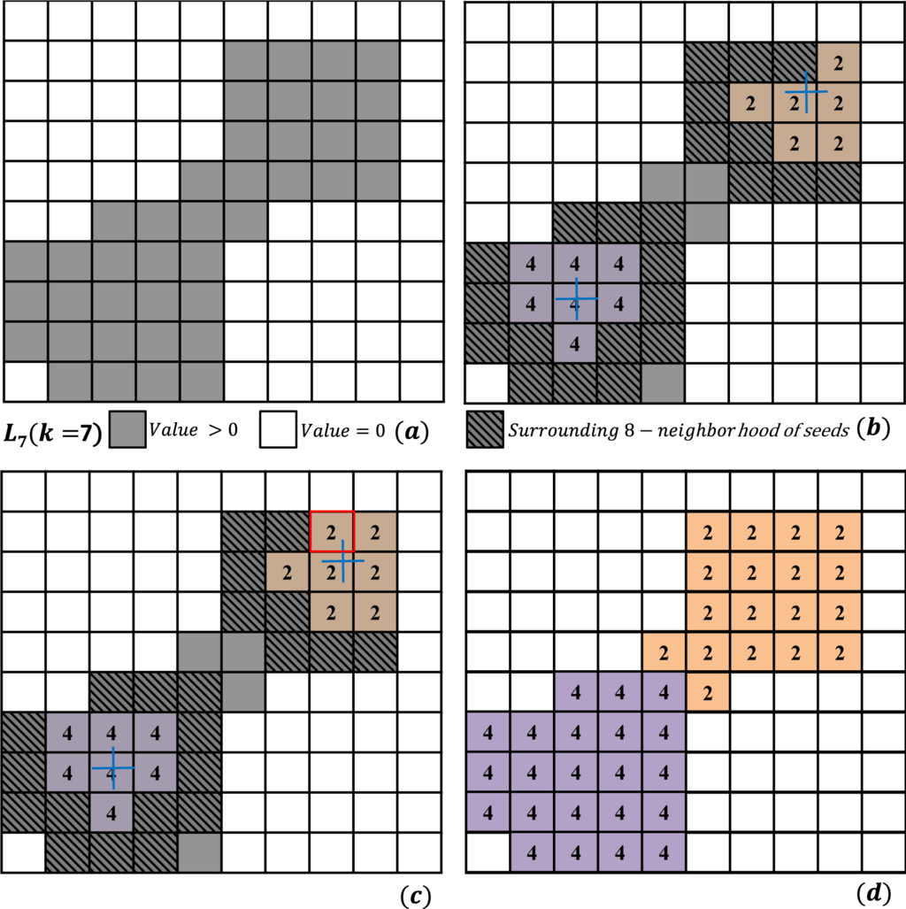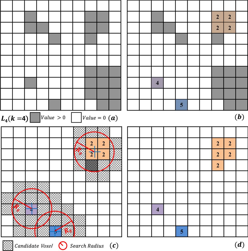 The top-down radius-constrained searching and marking method is used to identify the voxels constituting the trunk part in the voxel layers below L5. Figure 7 illustrates the search and marking process in voxel layer L4. In the searching and marking process in layer Lk (0 ≤ k < 5), the foreground voxels (i.e., value > 0) in the bottom face neighbors of the seed voxels in layer Lk+1 will be marked with the same group number as the voxel group in layer Lk+1 first (Figure 7(b)). Those marked voxels in layer Lk are the seed voxels of neighborhood searching and marking in this layer.