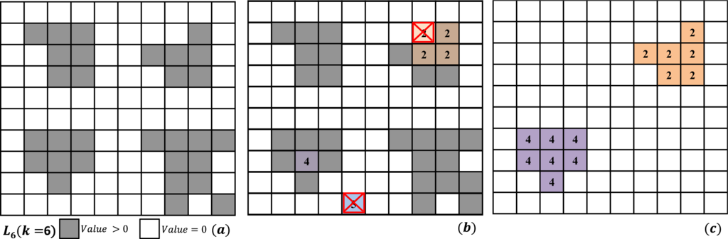 A set of hypothetical voxel layers are given in Figures 6(a), 7(a), 8(a), and 9(a) to illustrate the neighborhood searching and marking procedure. The voxels in grey represent those with a value larger than 0 (i.e., at least one laser scanning point is contained in the voxel). Such voxels, referred to as foreground voxels in this paper, represent a part of an object. The voxels in white represents the voxels with a value of 0. These white voxels are empty and no scanning laser points are detected and, hence, are treated as background voxels.