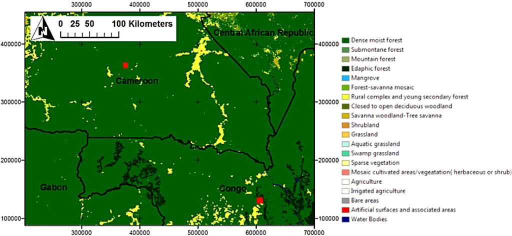 - Duveiller, G.; Defourny, P.; Desclée, B.; Mayaux, P. Deforestation in Central Africa: Estimates at regional, national and landscape levels by advanced processing of systematically-distributed Landsat extracts. Remote Sens. Environ 2008, 112, 1969–1981. [Google Scholar]