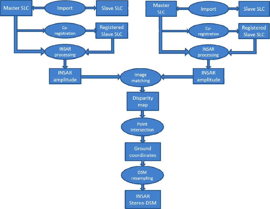 Starting from SAR images, DEMs can be generated by exploiting either the amplitude (radargrammetry) or the phase of the radar signal (interferometric techniques). To generate digital surface models (DSMs) from radar imagery we employed an algorithm that combines interferometric processing with radargrammetry. The main idea, sketched in [31], is based on acquiring two interferometric image pairs (i.e., four complex images) at two distinct incidence angles over the scene of interest. The two InSAR pairs are processed individually and the amplitude images of the two resulting (flat terrain filtered) interferograms then serve as the two input images for stereogrammetric processing. The main advantage of using the interferogram amplitude for stereo processing is that speckle-noise can be reduced leading to higher matching accuracies. Moreover, the standard interferometric DEM generation can be applied to the coherent parts of each interferogram. Finally, the interferometric DEMs and the stereometric DEM can be merged as they show complementary behavior: