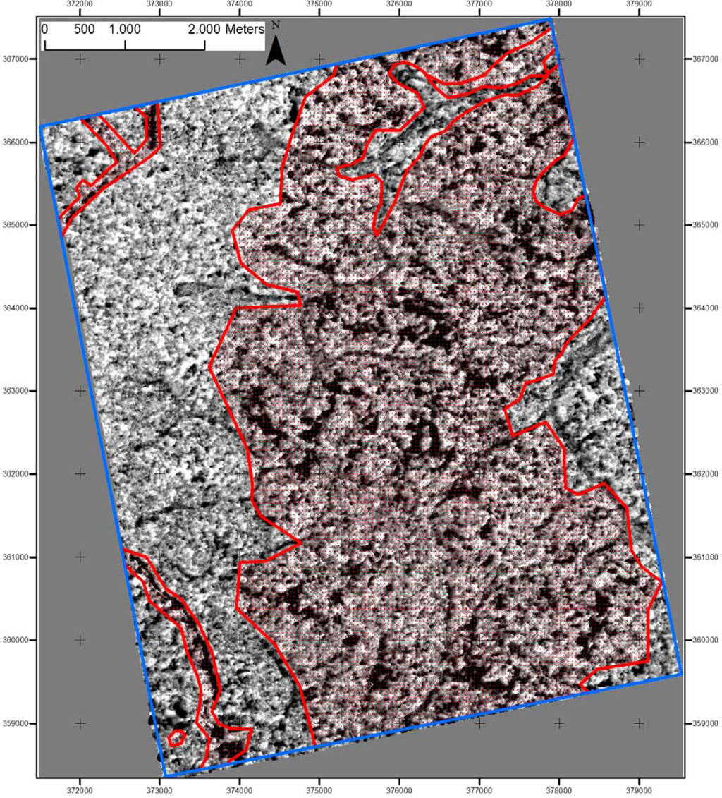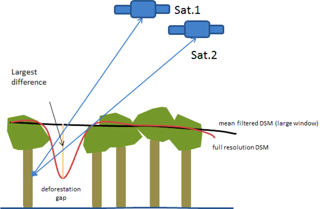 After DSM generation we tested two different approaches to derive forest disturbance from the 3D models. The first approach termed Height Variance Approach aims at detecting disturbances within the forest canopy and is based on a difference model between the full resolution surface model and a flattened mean filtered (window size >100 pixels) surface model. The method is sketched in Figure 4. Pixels with high difference values are then extracted with visually derived threshold values, e.g., all degradation features in the reference images have values of >10 m in the difference image, and serve as a preliminary forest disturbance mask. This mask is then aggregated using site specific distance and area values to map potential degradation areas.