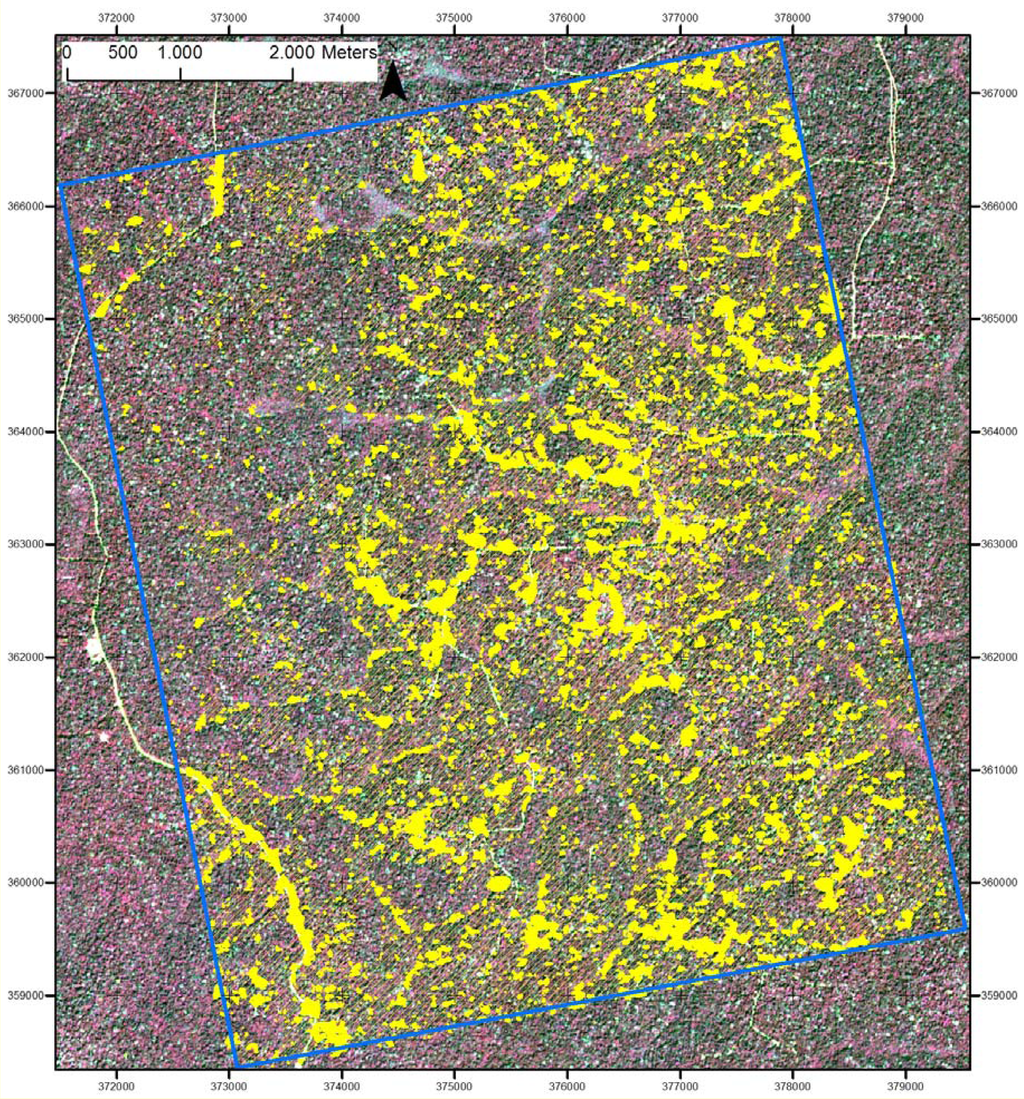 The difference model is classified into ‘areas of high difference values’ larger than 10 m (yellow patches in Figure 7); and ‘other areas’. These areas of high difference values are mostly logging roads and forest canopy disturbances and thus can serve as indicators for forest degradation. Using these indicator areas, a spatial aggregation as described above was performed to map potential areas of degradation. The output map is shown in Figure 7.