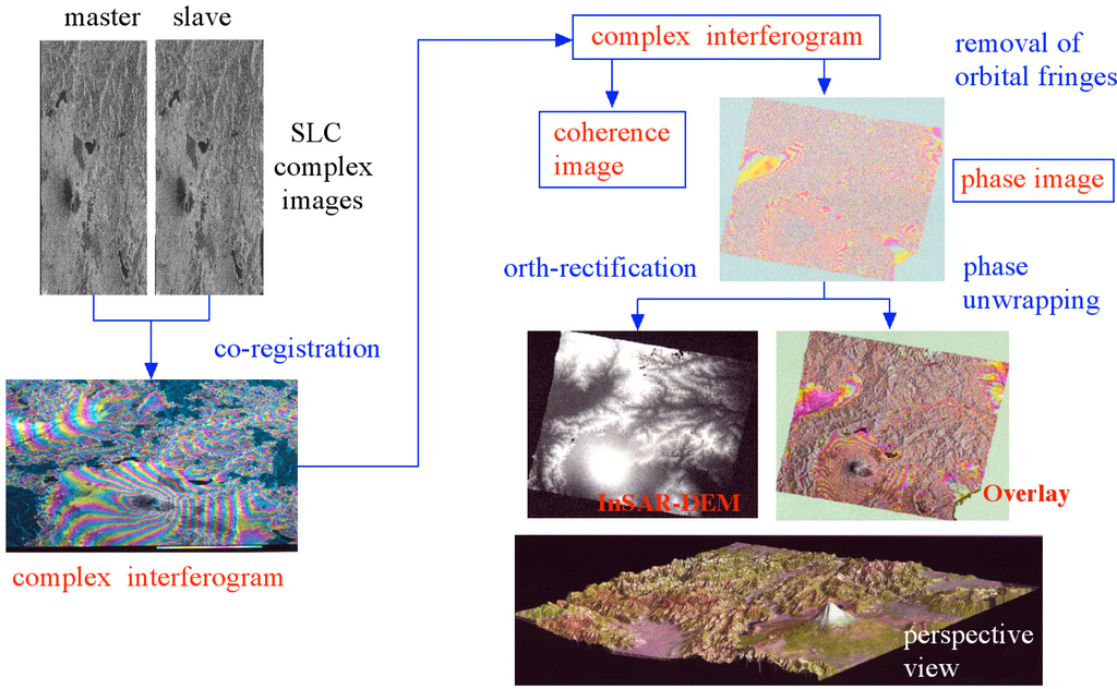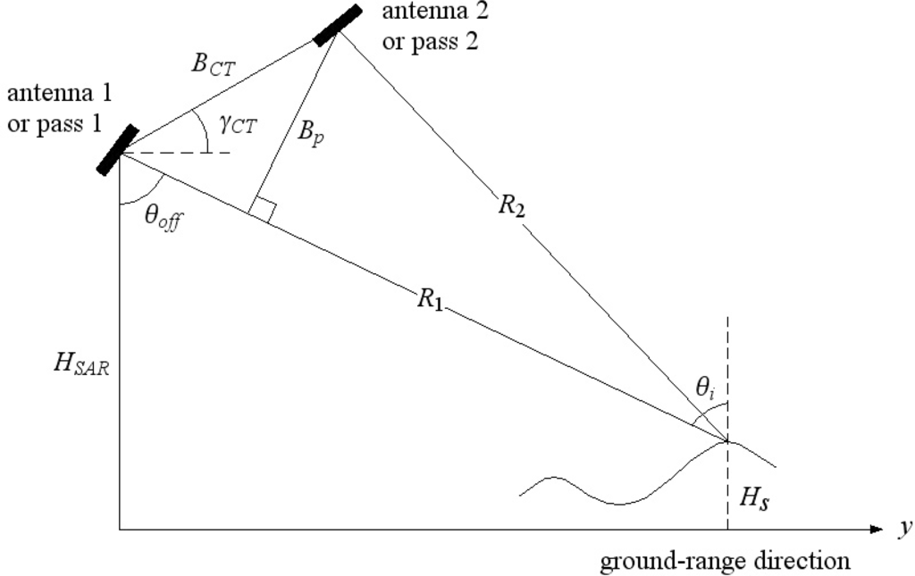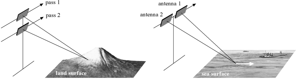 The potential information in the phase of SAR complex images has led a new technology of interferometric SAR (InSAR) [45,46]. Today, InSAR is an established technology, and the cross-track InSAR (CT-InSAR) has been used for producing topographic maps [47–51], and measurements of crust movement caused by earthquakes and volcanic activity, and those of glacier movement [52,53].