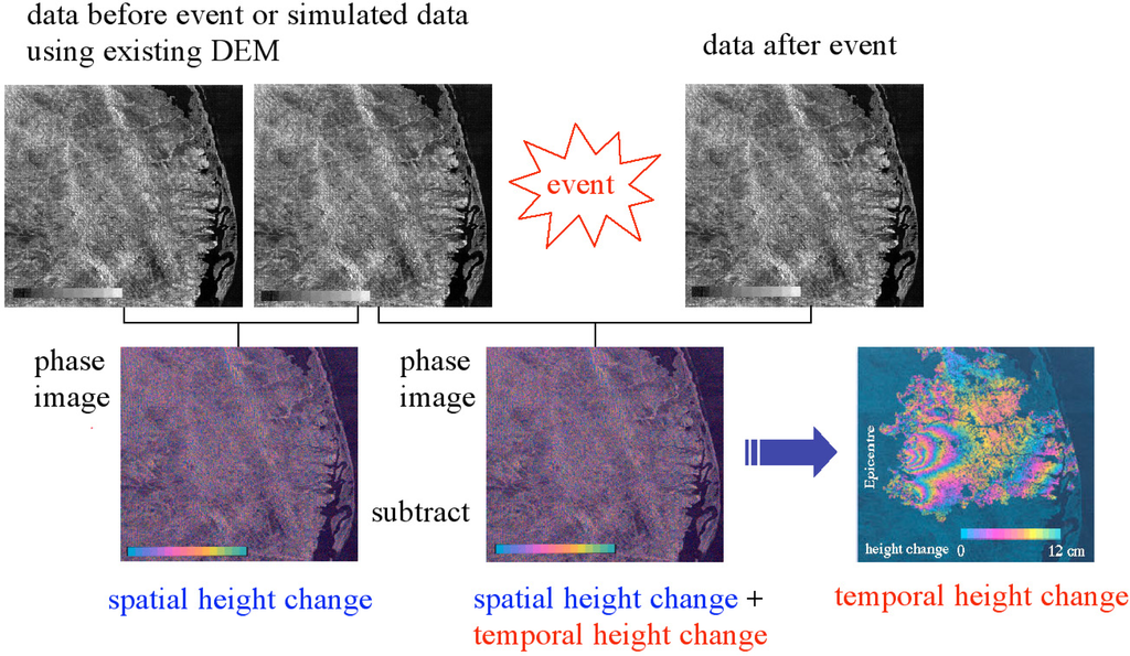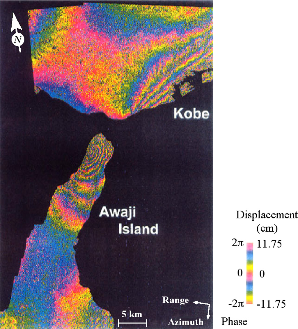 It was in 1974 when the concept of SAR interferometry for Earth observation was first proposed [47]. SAR interferometry is now a well known established technique. Cross-track InSAR (CT-InSAR), or generally referred to as InSAR, can produce a digital elevation model (DEM) for spatial changes of surface height; the crust movement and deformation caused by, for example, earthquakes and volcanic activities, and glacier flows can be measured by differential InSAR (DInSAR). For repeat-pass InSAR, where multiple data are acquired with a single SAR antenna using multiple baselines at different acquisition times, short revisit times are important to avoid temporal decorrelation, and the fine control of baselines is also essential. The temporal decorrelation caused by the changes in shape of scattering surfaces is large for high-frequency SAR such as TerraSAR-X and RADARSAT-1/2 in comparison with L-band SARs. For example, high temporal coherence was achieved by L-band JERS-1 SAR between the interval of 2 years 5 months for the surface height change caused by the 1995 Great Hanshin earthquake, Japan (see Figure 7). In order to achieve high temporal correlation and short baseline separation at X-band, a bistatic system is employed using TerraSAR-X and TanDEM-X [22,171]. For bistatic InSAR, fine positioning of two satellites and baseline control are required.