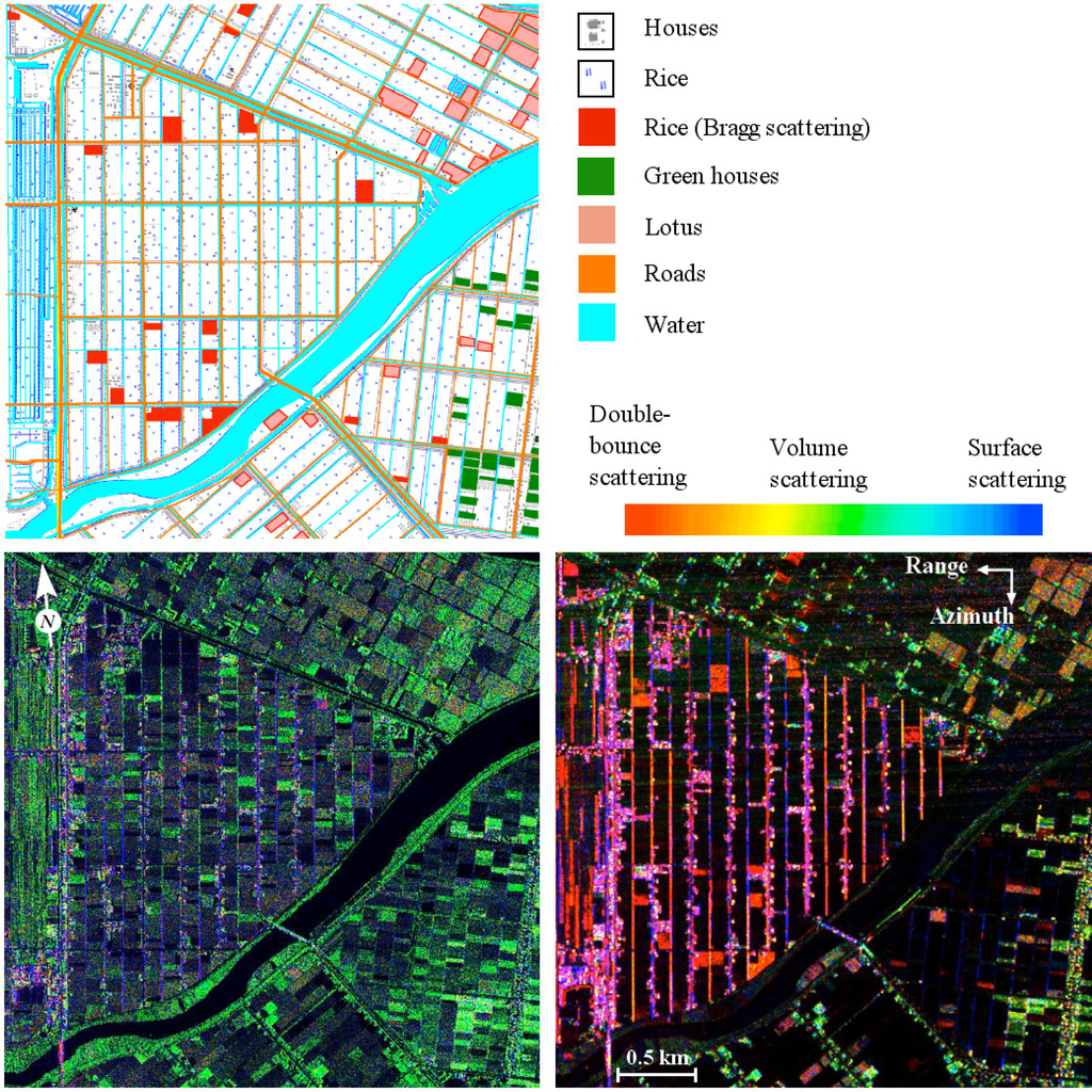 Measurements based on a multifrequency polarimetric scatterometer indicate that the backscattering coefficients of the high frequency bands (K- to X-bands) correlated poorly with LAI (leaf area index) and biomass of rice plants, while LAI is best correlated with the backscattering coefficients of C-band HH- and HV-polarizations, and the biomass is best correlated with those of L-band HH-polarization data. SAR measurements also showed that C-band HV-polarization data have a significant correlation with the development of rice plants [314,315]. In general, C-band microwave backscatter seems to show good correlation with rice plants with high signal-to-noise ratio (SNR), and it is also suggested the HH/VV polarization ratio is a useful parameter for monitoring rice during growing season and classification of rice and non-rice fields [308,309]. Similarly, a recent study using TerraSAR-X data showed a significant correlation of the X-band HH/VV ratio with the development of rice plants [313]. At L-band, it was reported that little radar backscatter from rice fields was observed in JERS-SAR and airborne Pi-SAR L-band data, and occasionally it yielded the Bragg resonant backscatter from regularly planted bunches of rice plants [301,305,307]. A recent report [311], however, showed some promise of utilizing L-band HV-polarization data by avoiding the Bragg scattering. Wang et al.[310] also showed the possible use of PALSAR L-band HH-polarization data that are sensitive to the structure of rice plants than VV-polarization data. Polarimetric analyses have been studied for the application to rice monitoring, and Li et al.[120] concluded that the Touzi decomposition [108] is best for classification of rice fields, requiring only a single date of imagery. Based on the analyses of RADARSAT-2 quad-polarization data, Wu et al.[314] suggested a good set of parameters to classify rice fields are those at HH- and HV-polarizations, and HH/VV ratio.