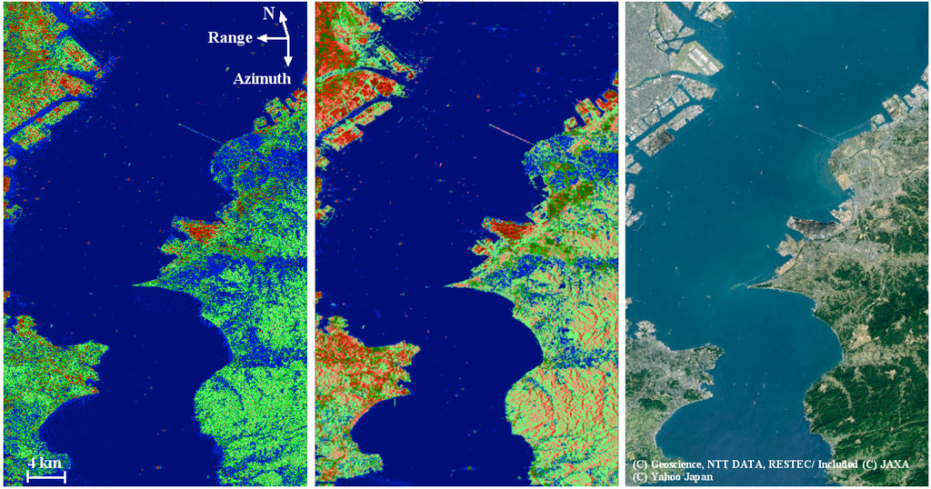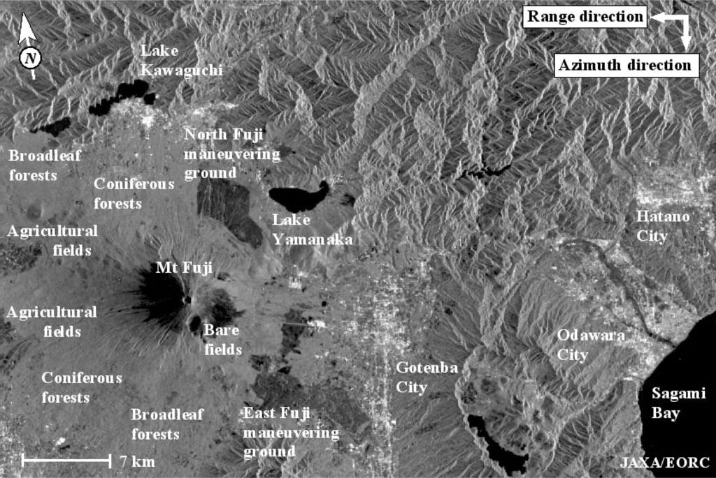 Figure 8 is an amplitude image around Mt. Fuji, Japan, acquired by ALOS-PALSAR L-band SAR. This amplitude image contains wealth of information on the scattering objects. For example, there is no backscatter from the shadowed part in the mouth of Mt. Fuji, and the image consists of just system noise. Normalized radar cross section (NRCS) is little from dead-calm water surface of lakes and sea, because, under no wind or very low wind speed, the most of the incident microwave is reflected in the specular direction and little is backscattered. However, NRCS increases with increasing wind speed since the surface becomes increasingly rough. NRCS from bare soil and weed in the maneuvering grounds is slightly larger than NRCS from the water surface due to backscattering from random rough surfaces. Vegetation in agricultural fields has larger NRCS than the former areas, and NRCS from forests is very large. Increased NRCS from vegetation and even larger NRCS from forests are mainly caused by volume and multiple scattering. The largest NRCS is from buildings in the cities because of multiple reflections between the ground and building walls. The very large NRCS from urban areas arises if the roads and building walls are aligned orthogonal to the radar illumination direction. Thus, if the urban structures are not in the orthogonal to the line-of-sight direction, the incident microwave does not backscatter toward the radar antenna and the images appear dark. In order to compensate this effect, polarimetric analyses can be applied to enhance the images of urban areas [118]. Another way of compensating this effect is to use SAR images acquired from different geometries.