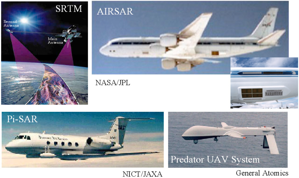 There are many airborne SARs developed by various organizations as in Table 3 with examples in Figure 4, and almost all current systems operate at multi-frequency full polarization mode, some of which are equipped with cross-track and/or along-track interferometric modes. The spatial resolution is order of meters or less.