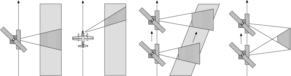 With some exceptions of parabola antennas used in the SAR-Lupe constellation, the most current SAR systems use phased array antennas for beam forming using analogue electrical circuits. An alternative method of beam forming is to use digital circuits, known as digital beam forming (DBF). DBF is a technique of producing multiple beams by dividing an antenna into multiple sub-apertures, and digitally processing the signals of each sub-apertures independently [187]. The technique has been used in HF radars, sonar, and communication systems [188–191]; the idea of multiple-beam wide-swath SAR has also been suggested since 1980s [192–194]. Currently, DBF is considered to be a promising concept for future spaceborne SAR systems for solving the trade-off between the swath width and spatial resolution due to the limitation imposed by range and azimuth ambiguities. In the conventional SAR systems based on the analogue RF beam forming, the swath width and resolution are inversely proportional. For example, for TerraSAR-X, the azimuth resolution of 1–2 m can be achieved in the spotlight mode but with a narrow swath width of 10 km, while the swath width of the scan mode is 100 km, but the azimuth resolution is reduced to 16 m (e.g., [195,196]). A basic design of achieving high resolution in wide swath is DBF on receive with the conventional analogue beam forming on transmit, where a wide swath is illuminated using either a small part of an antenna or a small separate antenna, and the scattered signal is received by multiple independent sub-apertures; these signals are then processed independently to produce images of multiple swaths and to produce a wide-swath image by combining them. Several different approaches have been proposed, including a squinted geometry, a displace phase center antenna technique, both of which use sub-apertures aligned in the azimuth direction, a quad-element rectangular array system, and a high-resolution wide-swath (HRWS) system employing multiple sub-aperture elements split into both the azimuth and range directions [192–194,197–199], as well as the use of a large reflector antenna with feed arrays [158,200,201]. As mentioned in Section 2.2, Tandem-L will have 10 m resolution covering 350 km swath with repeat cycle of 8 days [22,158]. A new different approach to the DBF-based HRWS SAR system has also been proposed using a staggered illumination by continuously varying pulse repetition frequency with a full aperture on both transmission and reception [198,202,203].
