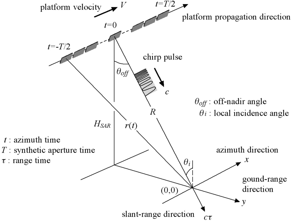 At this stage, it is useful to remind the geometry and terms used for the SAR systems as shown in Figure 6. An antenna transmits a series of FM (Frequency Modulation) pulses also known as chirp pulses at an off-nadir angle θoff off in the plane normal to the satellite trajectory as it travels in the azimuth direction with a constant velocity V. The illumination direction is called the slant-range direction, and the ground-range direction is the illuminating direction on the ground. The angle between the illumination direction and the direction vertical to the surface is called incidence angle θi, and is almost the same as the off-nadir angle for airborne systems. For spaceborne systems, the Earth’s curvature needs to be taken into consideration, and therefore the incidence angle becomes several degrees larger than the off-nadir angle. As is well known for most of SAR systems, the fine resolution in the range direction is achieved by pulse compression, and that in the azimuth direction by aperture synthesis [5].