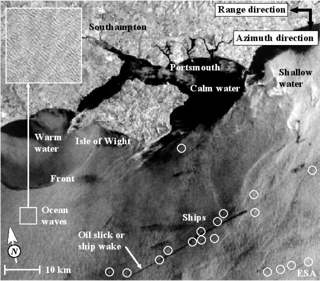 Figure 9 is the ERS-1 C-band SAR image of the English Channel. The microwave backscattering process from sea surface is predominantly surface scattering (apart from volume scattering from forms and sprays, and man-made targets such as vessels), and NRCS depends on surface roughness and dielectric constant of the water, e.g., [345,351,352]. The elementary scatterers are small-scale waves whose wavelength satisfies the Bragg resonance condition, LBragg = λ/(2 sin θi), where LBragg is the wavelength of small-scale waves, λ is the radar wavelength and θi is the incidence angle. It may be of historic interest, but as the name suggests, the Bragg resonance scattering was first discovered by Bragg in the X-ray diffraction from crystals in 1913 [353,354]. It was 42 years later in 1955 that the phenomenon of the Bragg scattering in the microwave backscatter from the sea surface was first found by Crombie [355]. There are numerous experimental evidence to support the theory of Bragg waves as the main elementary scatterers on the sea surface. Temporal and spatial changes of the Bragg waves caused by, for example, ocean waves, internal waves, and ocean wind, modulate the radar backscatter, and thus, these oceanic features can be made visible in SAR images.